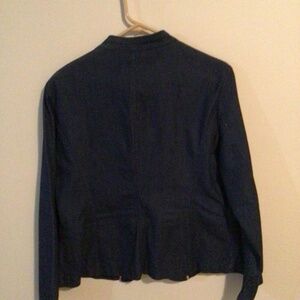Ladies denim blazer by Nicole Miller in ladies size 14. Has just enough spandex to allow stretch to make it comfortable to wear all day. Works great to dress up or dress down.