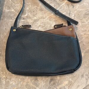 Chala crossbody bag in brown and navy. Features charming dragonfly and leaf design. 3 compartments! Adjustable shoulder strap. Clean inside and out, great used condition. See pictures.