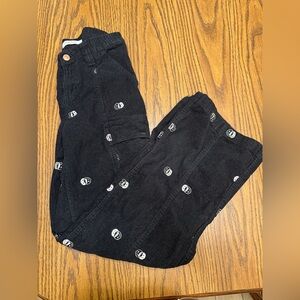 Crafted from a rigid corduroy fabric, these low-rise pants are complete with allover smiley embroidery, cargo side pockets, a stretchy back elastic waistband, and an ultra-slouchy relaxed leg that pools at the