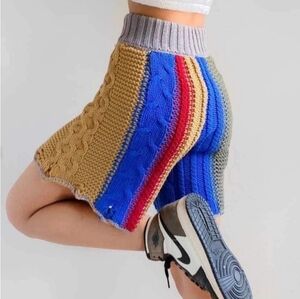 Vibrant and stylish, these multicolor knit shorts are perfect for a bold look. Featuring a mix of blue, red, and tan, they offer comfort and flair for any casual outing.