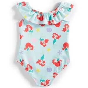 * Swimsuit: pull-on style; round neck; ruffle trim at neck; The Little Mermaid graphic-print pattern