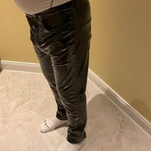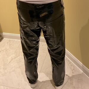 These Andrew Christian dress pants boast a sleek, form-fitting design in a striking black color. The glossy finish adds a touch of sophistication, making them ideal for formal occasions. Their full-length cut enhances the elegant silhouette, perfect for elevating any outfit. Waist 32, Length 32