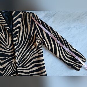 This striking blazer features a bold zebra print in black and tan, offering a dramatic and eye-catching look. Crafted from a soft, plush fabric, it provides both comfort and style.