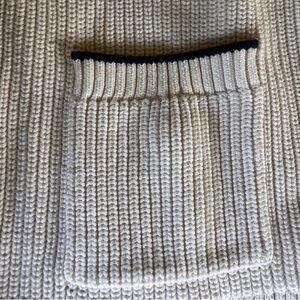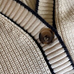 This cream cardigan from Old Navy offers a timeless look with its black contrast trim and relaxed fit. The medium-weight knit and ribbed cuffs make it perfect for layering in any season. Its simple, elegant design ensures versatility for various occasions.