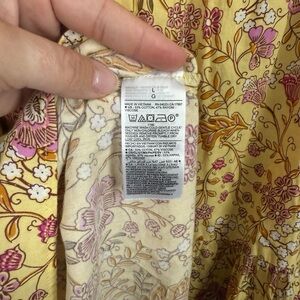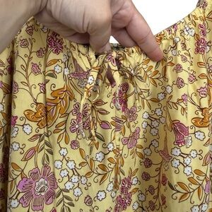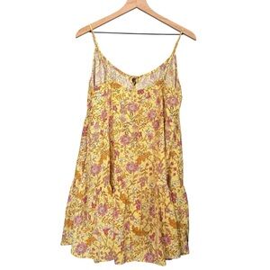 Stylish dress with floral design. Features yellow and pink hues. Ideal for warm weather. Spaghetti straps are adjustable, ties in the front and has pockets!!