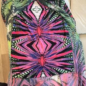 Vibrant high low maxi skirt, sheer overskirt with coordinated lining. Elastic waist measures 14”, front length 27”, back length 37” Features green and pink tones, palm print