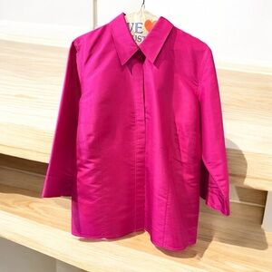 Chico’s Size 2 Bright Pink 100% Silk Blouse / Jacket. Perfect for any occasion. Hidden button placket. 3/4 Sleeves.