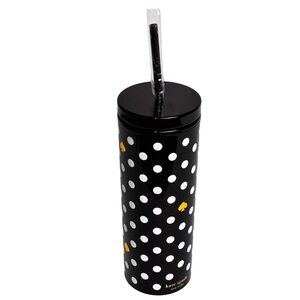 Stylish Kate Spade tumbler with black and white polka dot design features double wall insulation and holds 16 ounces suitable for both hot and cold beverages. Comes with a secure lid and matching straw.