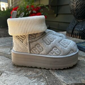 Experience ultimate comfort and style with UGG's gray winter boots, designed to keep your feet warm and dry. These boots feature a sturdy platform sole, perfect for navigating through rain and snow. Ideal for winter adventures, they combine functionality with a sleek, modern look.