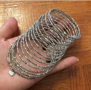 Organically-shaped stainless steel beads wrap around 18 layers of memory wire and have tiny beaded dangle heart charms at each end of this shiny, slinky bracelet. Feels great on the wrist--a high-quality piece with a nice weight to it (not heavy--just right). Fits my 7" wrist perfectly and would be best for smaller wrists. A Boho-rock-chic bracelet that will show off at work with ease, as well.