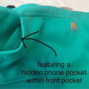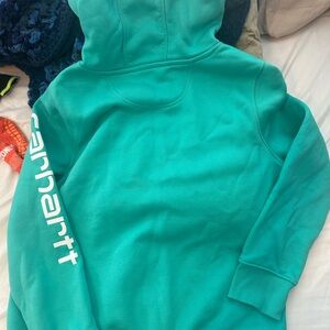 Perfect condition, like new (no tags). Women’s Aqua hooded sweatshirt with Carhartt logo & graphic name down left sleeve. Features front kangaroo pocket with hidden phone pocket for extra security.