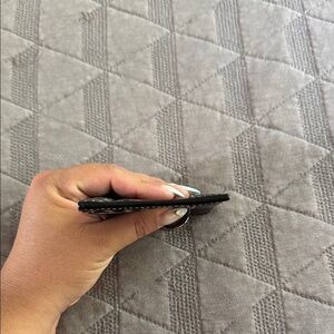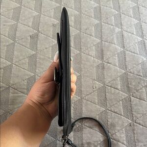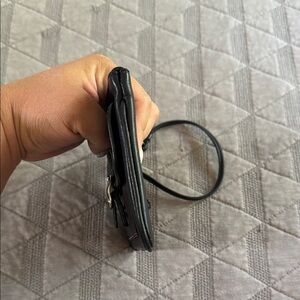 Elegant black wristlet with buckle. Includes matching gray card holder. Ideal for daily essentials.