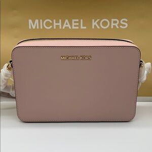 NWT authentic Jet Set Michael Kors Women's Jet Set Large Crossbody Blossom Leather Michael Kors Jet Set crossbody bag crafted in 100% saffiano leather with gold-tone hardware, featuring 1 main compartment, wall slip pocket, front slip pocket, and adjustable leather/chain strap with a 22.5 -25 drop. Dimesions: 9.5 W x 6.25 H x 2 D. Style: Cross‑body Material: Genuine Leather