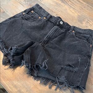 Stylish black jean shorts. Frayed hem. Classic five-pocket design. Perfect for casual wear. Worn only once, freshly washed.