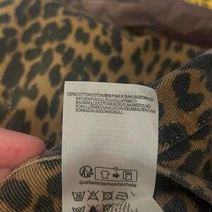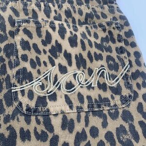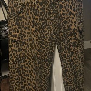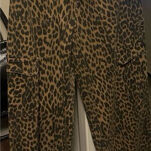 These jeans feature a striking leopard print with tan spots on a rich brown background, offering a relaxed and stylish wide-leg fit. Made from a soft, denim-like fabric, they ensure both comfort and a trendy appearance.