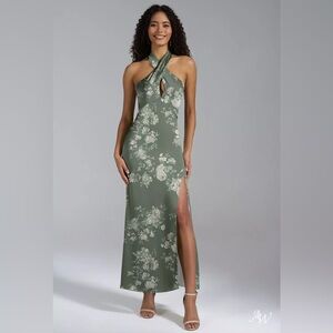 Captivate the room in this sleek, sultry one-shoulder floral trumpet gown. Featuring hand-embellished fabric, a strappy asymmetrical open back, and a daring thigh-high slit, this gown is a glittering, show-stopping choice for any special occasion.