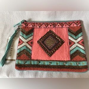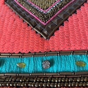 Stunning artwork on a bag! Beads, sequins, and ‘gemstones’ adorn this bag. Can be used as clutch (wristlet is removable) or the most beautiful tablet case for travel! Inside is one large compartment with one small open pocket.
