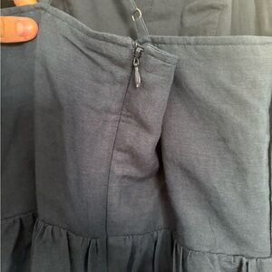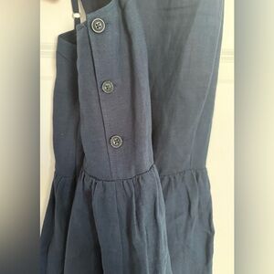 Stylish navy lien blend midi dress that’s perfect for a summer day! Spaghetti straps that cross in the back. Smocking and zipper up back. Faux buttons on each side of the bust for detail. Fully lined. Size Medium. Worn once and in excellent used condition!