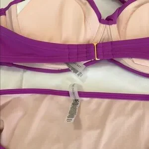 Dive into style with this stunning Victoria's Secret bikini, featuring a rich fuchsia hue and elegant gold trim. The bandeau style top offers molded cups for added support, while the classic bikini bottom ensures a comfortable fit. Perfect for making a bold statement at the beach or pool.