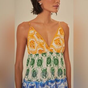 Bright mini dress with a playful tiered style. Features bold yellow, green, blue, and red patterns. Ideal for a standout look.