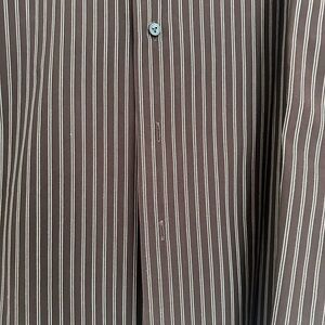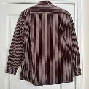 This BCBG shirt showcases a rich brown color accented by subtle vertical stripes, making it a stylish choice for casual outings. Made from a soft cotton blend, it offers comfort and a classic button-down design. Its versatile style is perfect for enhancing your everyday wardrobe. Preowned, good condition.