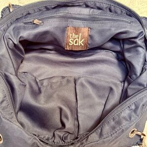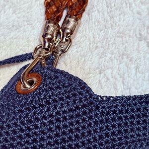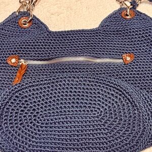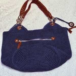 Vtg The Sak Handwoven Navy Blue Crochet Tote Bag with Leather Straps