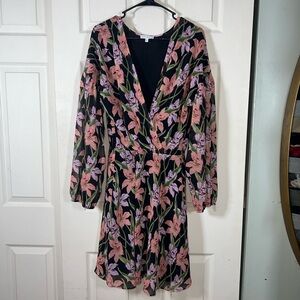 Elegant black maxi dress featuring a floral pattern and a stylish slit, plunging neckline, button accents on waist, smocked waist, smocked sleeves at wrist. Superbly comfortable….just gorgeous