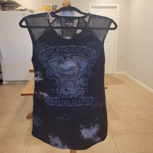 Black tank with Harley-Davidson logo. Features mesh shoulders and intricate graphic design. Rhinestones & embellishments. Keep it cool with this Harley-Davidson tank.