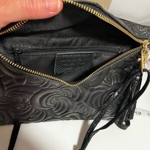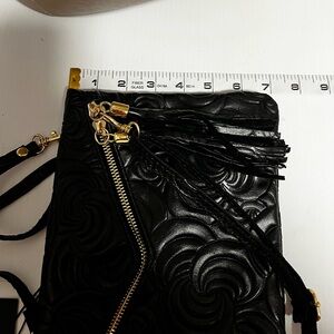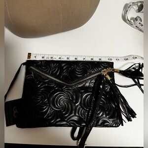 This elegant black crossbody bag features a stylish floral design, perfect for any occasion. Its sleek and versatile look makes it a must-have accessory.10” by 7”