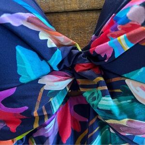 The twist-front v-neck with a peekaboo keyhole detail creates lovely ripples of shirring that accentuated the bust line while making worry areas magically disappear.