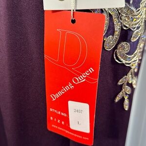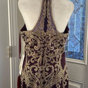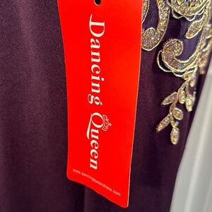 This stunning gown by Dancing Queen features a rich purple base adorned with intricate gold embellishments, creating a captivating contrast. The halter neckline and sleeveless design enhance its elegant silhouette, while the backless style adds a touch of allure. Perfect for prom or cocktail events, this dress promises to make a memorable impression.
