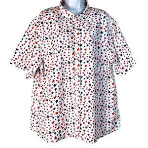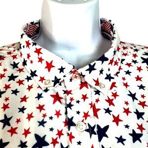 Watch the fireworks, throw a backyard cookout party, or go tailgating in this patriotic button up shirt that features red and white stars on a white background.