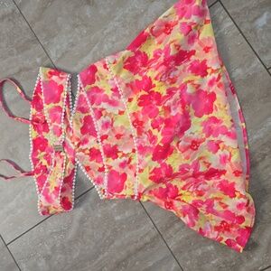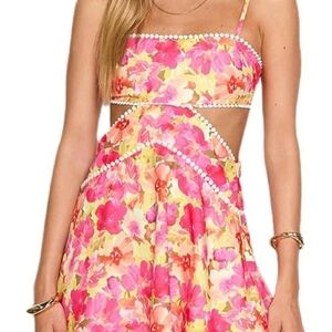 Vibrant floral dress with cutout design and pearl accents. Features pink, yellow, and white colors.