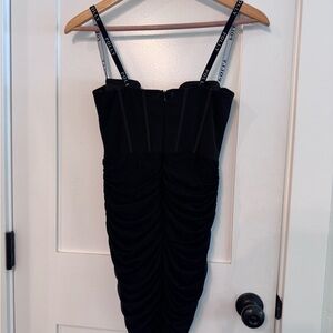 Chic black mini dress with a body-hugging fit. Features structured bust and branded straps. Ideal for a night out. Size 2 US. EUC no flaws noted.