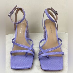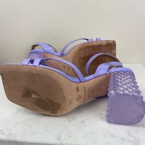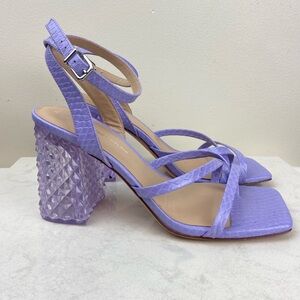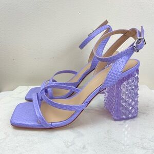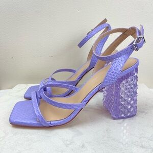 Turn heads with these striking Antonio Melani Katona heels featuring a vibrant lilac snake-embossed faux leather upper and a unique geometric lucite block heel. Equal parts bold and elegant, these sandals bring fashion-forward flair to any outfit.