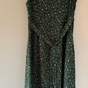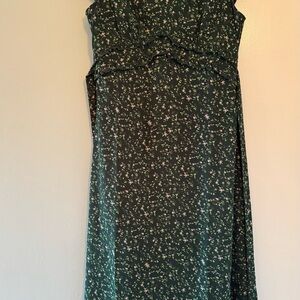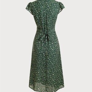 Elegant green midi dress with floral pattern. Features a flattering V-neck and cap sleeves. Perfect for any occasion