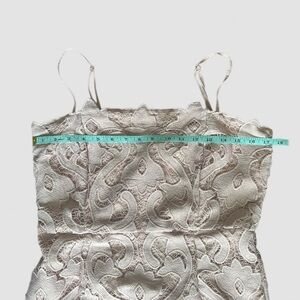 This knee-length mini dress features a delicate lace overlay, a square neckline, and thin shoulder straps. It’s fully lined for comfort and has a back zip closure. Made from 100% polyester. Shows minimal wear with a few loose threads, but overall the dress is intact and in great condition.