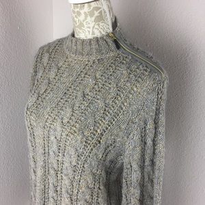 Open weave gray sweater with gold metallic thread detail. Zip shoulder detail.