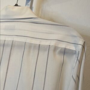 Elevate your wardrobe with this designer cream striped shirt. Perfect for any occasion, it offers a classic, timeless look. Size 15 1/2….34-35. Slight yellowing in the armpits.