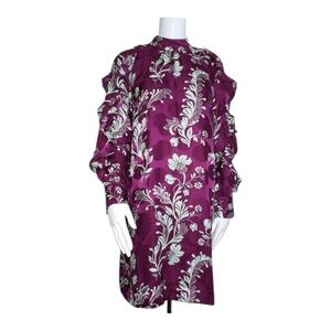 Gorgeous and rare J. Crew Collection silk dress featuring a rich purple floral print with green accents, high neckline, and dramatic ruffle sleeves. Crafted from luxurious 100% silk, this swingy mini silhouette offers an elegant and feminine look perfect for weddings, parties, holidays, special events, or date nights. New with tags.
