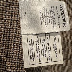 Stylish quilted jacket. Olive green with brown accents. Perfect for outdoor adventures.