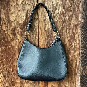 This Nanette Lepore Nella shoulder bag is a stylish and functional accessory for any woman. The exterior is a rich black with pebbled finish. It features a snap closure and an elegant braided shoulder strap. The bag is made of vegan leather and has 2 inside pockets (one which may be zippered) and one exterior slip pocket. It is a medium size and is designed with gold-plated hardware and checkered scarf detail.