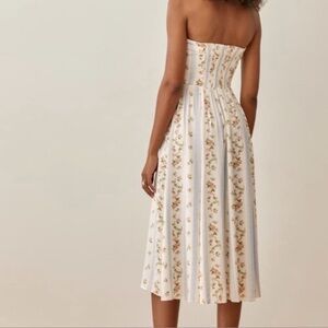 Reformation Aymeline Midi Strapless Dress with sweetheart shaped neckline in Surrey