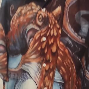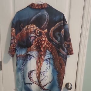 Dive into style with this unique octopus print men's shirt. Featuring a blend of blue and brown hues, this shirt is perfect for casual outings. Stand out with its artistic design and comfortable fit.