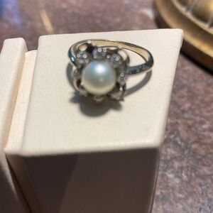 This exquisite ring features a lustrous pearl surrounded by sparkling diamonds, set in a sleek white Gold Band. Marked 14 k. Size 7 1/4. Excellent shape.