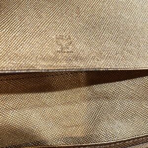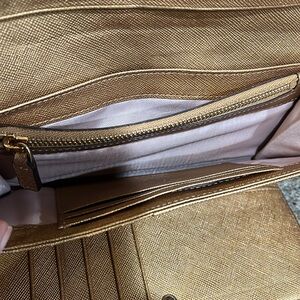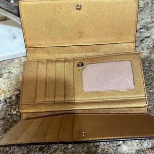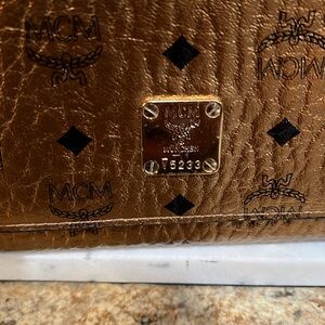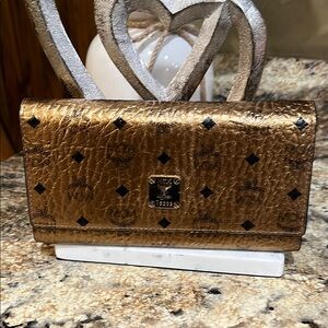 Chic MCM wallet in metallic gold. Features iconic logo pattern. Stylish and practical.