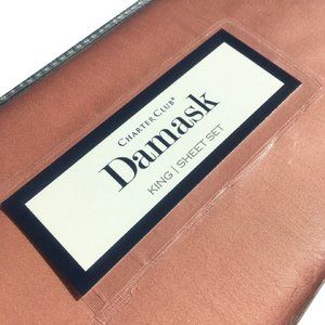 brand new Charter Club Damask Solid 550 Thread Count 100% Cotton KING Sheet Set ... King Flat Sheet, King Fitted Sheet, and 2 King Pillowcases. The manufacturer's name for the color is Baked Clay ... it is an Orangey-Pink Terracotta-ish hue ... and the sheet set is solid / no pattern / unpatterned. The label on the package states: "King Flat Sheet finished size is 108 inches x 110 inches. King Fitted Sheet is 78 inches x 80 inches and fits mattresses up to 18 inches deep. Each King Pillowcase is 20 inches x 40 inches. Machine washable." Condition is brand new in undamaged original retail packaging ... UPC 766390978274.