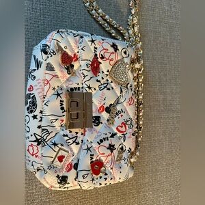 Really cut Aldo bag quilted design and vibrant white and red floral pattern. The gold-toned chain strap and twist lock closure.