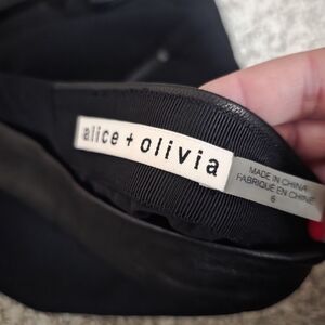 This chic black mini skirt by Alice + Olivia features a flattering A-line silhouette, perfect for work or cocktail events. Crafted from a structured matte fabric, it offers a sleek and sophisticated look. leather trim throughout. size 6. excellent condition.