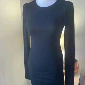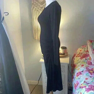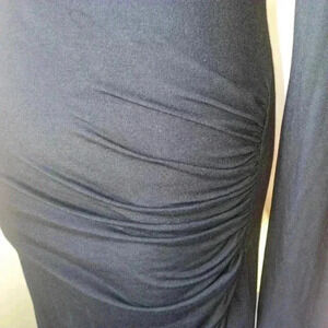 Classic black dress. Stretch knit. Slightly puffed shoulder. Ruching at waist. Knee high slit. Pull-over styling. Material: 90% Tencel Lyocell 10% Spandex. Hand wash cold. Size XS. EUC.